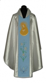 Ornat haftowany z wizerunkiem MB Ostrobramskiej. Tkanina polyester. Długość 125cm.