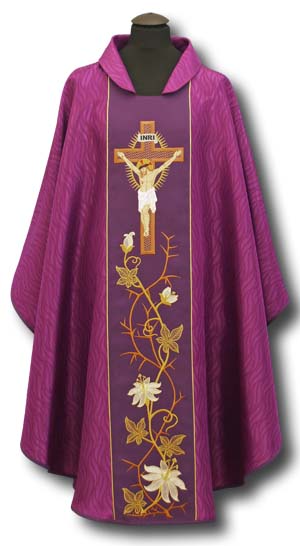 Ornat haftowany z wizerunkiem Pana Jezusa na Krzyżu. Tkanina adamaszek. Długość 125cm.
