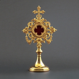 Relikwiarz mosiężny złocony. Wysokość 33cm. Średnica gniazda 5,5 cm.