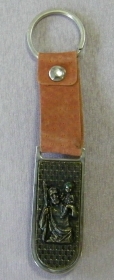Breloczek ze Św. Krzysztofem melal łączony ze skórą. wymiary bez uchwytu 7,5cm.x2,5cm. Produkt polski.